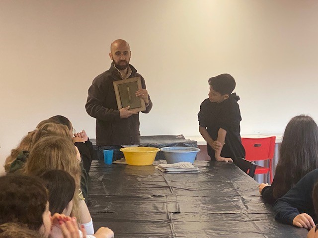 Cada jovem elaborou e decorou uma folha de papel reciclado a partir de desperdícios de papel de jornal.