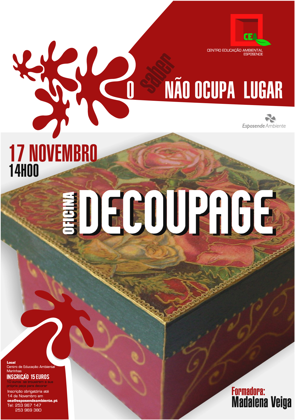 No próximo dia 17 de Novembro, pelas 14h00, irá se realizar a iniciativa Oficina “O saber não ocupa lugar” – Decoupage. Não se esqueça em participar!