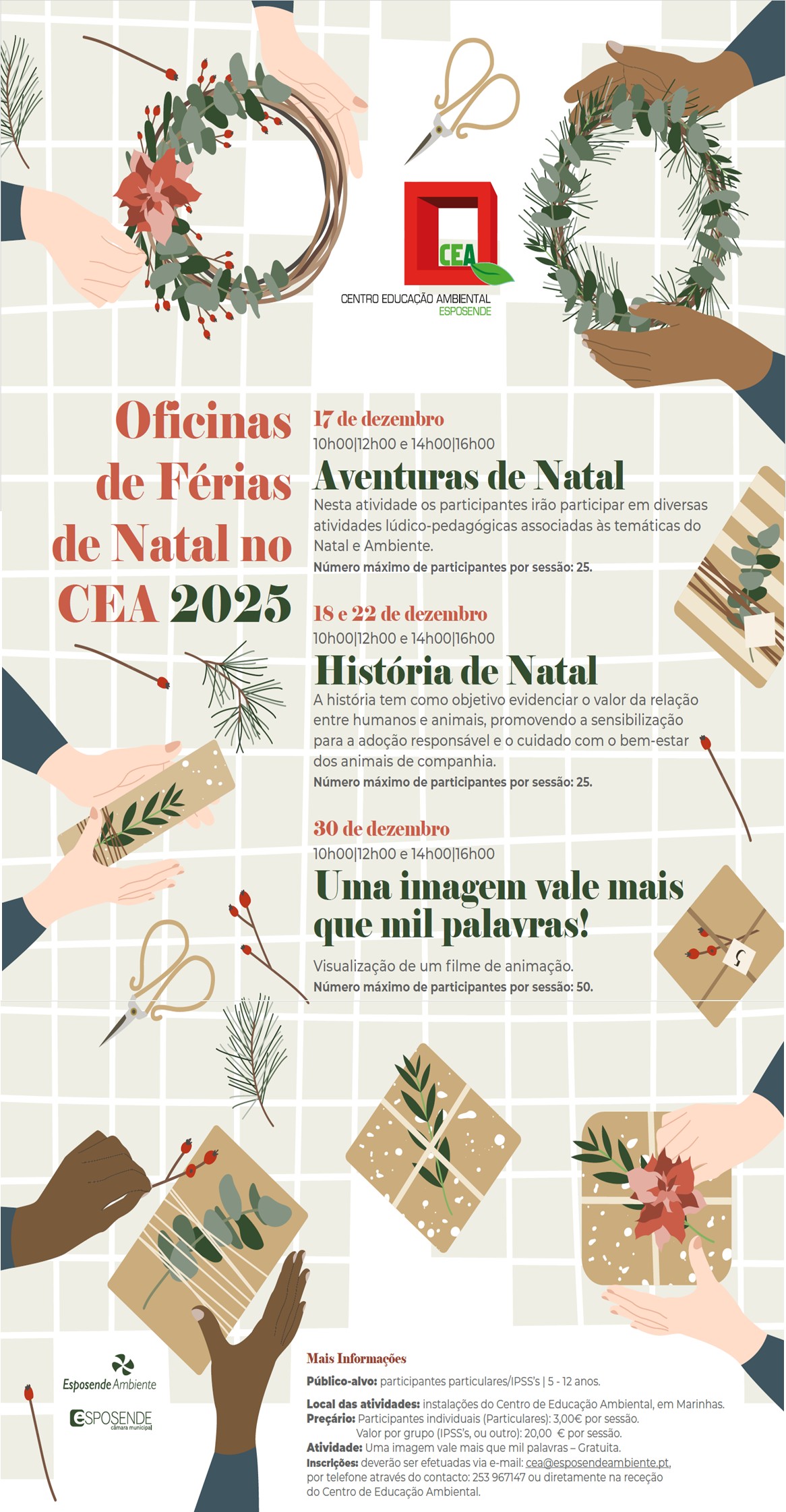 O Centro de Educação Ambiental irá promover durante os dias 17, 18, 22 e 30 de dezembro, as Oficinas de Natal no CEA 2025, iniciativa inserida no âmbito do Plano de Atividades do CEA de 2025-2026, cuja programação segue abaixo no presente email.